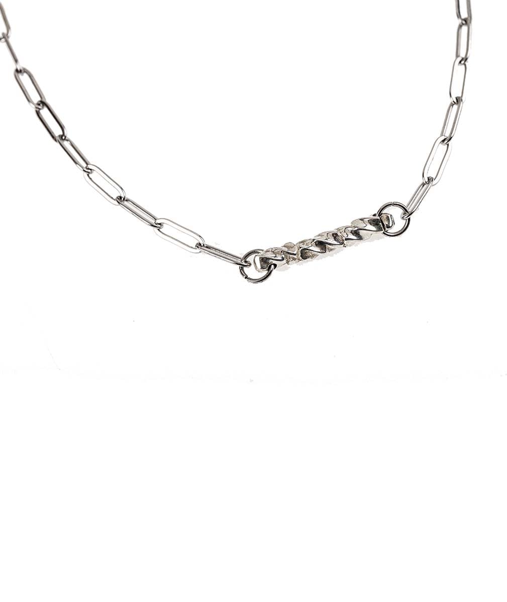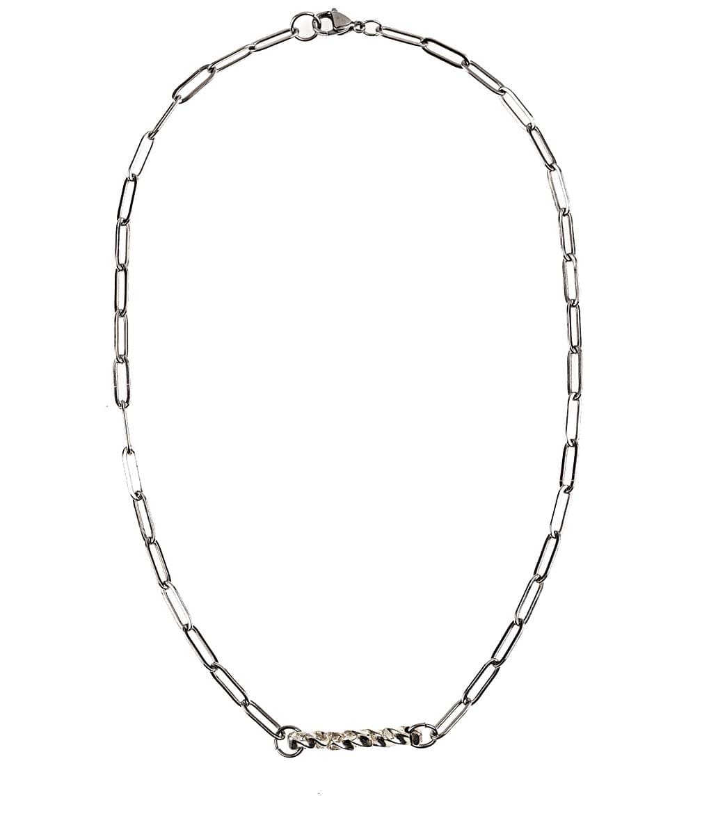 Dije hecho a mano en Plata Ley 950, procesos de tallado, laminados, y entorchados, cadena en acero quirúrgico europeo.