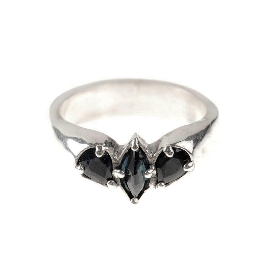 Este anillo one of a kind con engaste de 3 zafiros, 2 en lagrima y un marquise en la mejor sintonia.